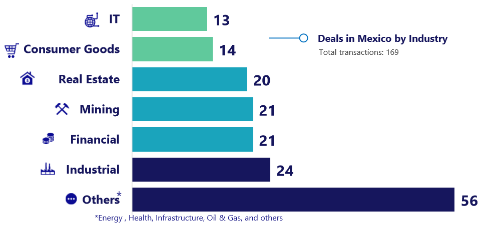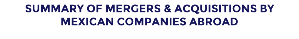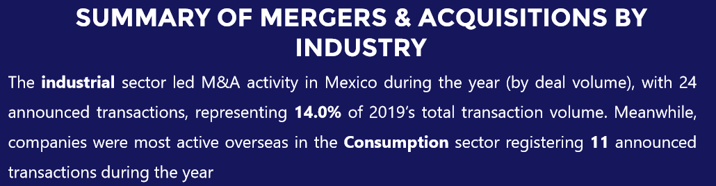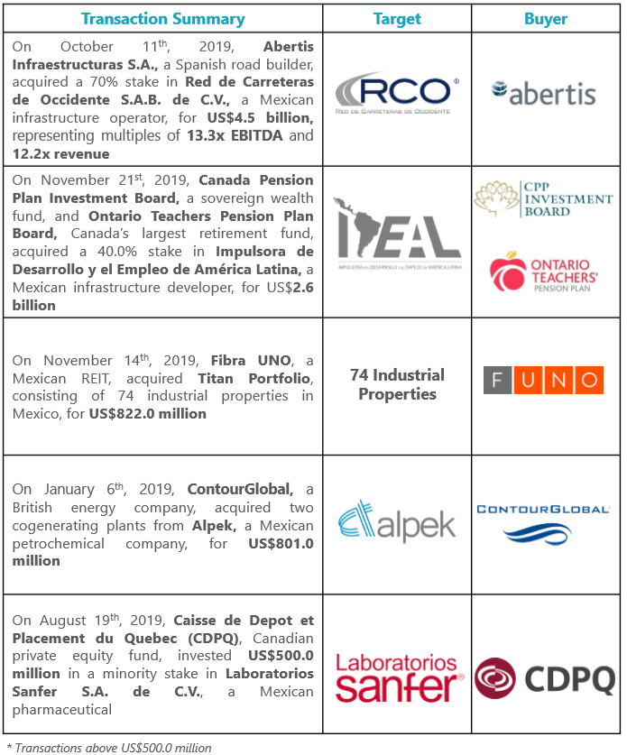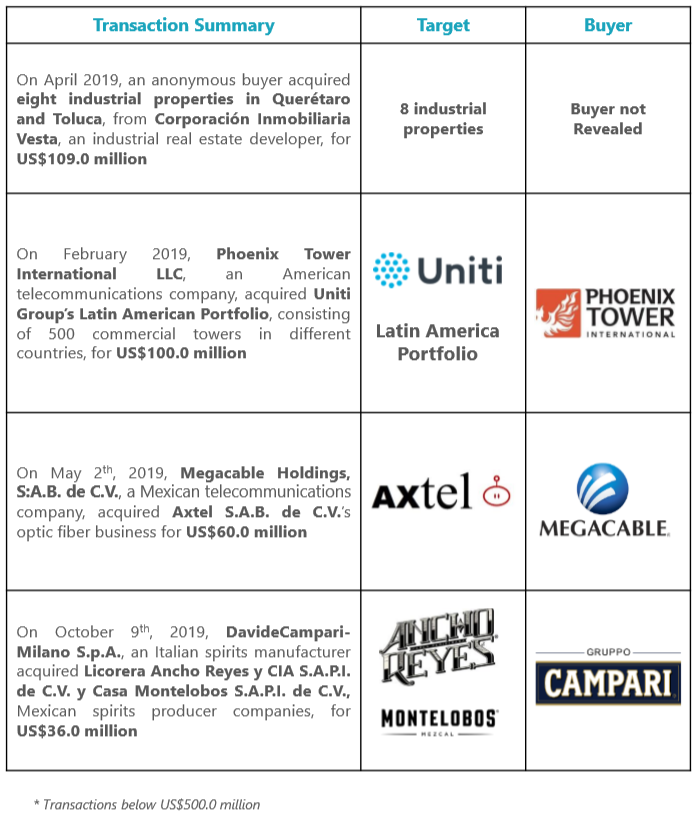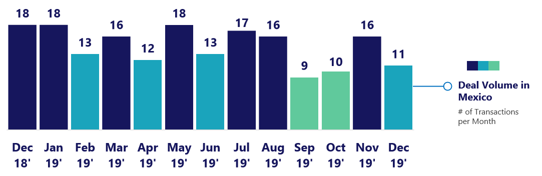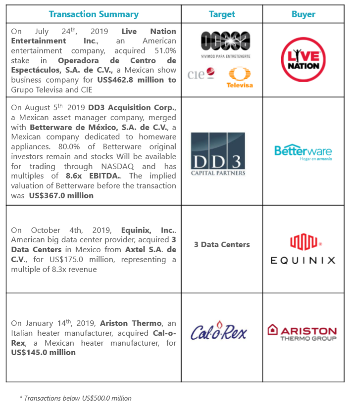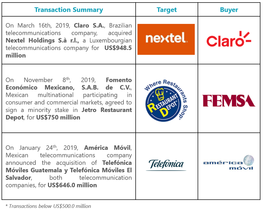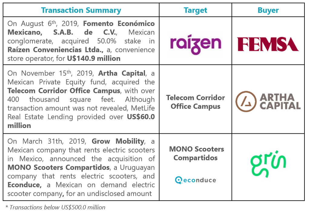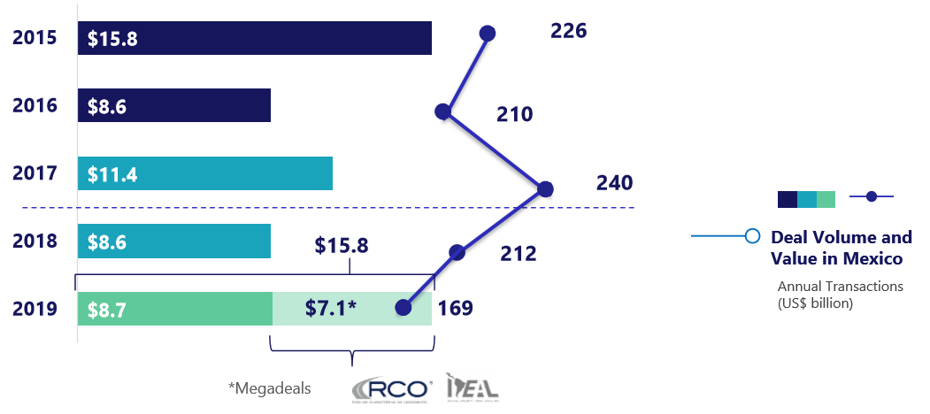 In 2019, the volume and value of announced transactions accumulated to 169 and USD$15.8 billion, respectively, representing a decrease in volume of 25.0% and an increase in reported value 33.7% Year-Over-Year. It is necessary to clarify that two megadeals in the infrastructure sector representUS$7.1 billion of the total value reported.