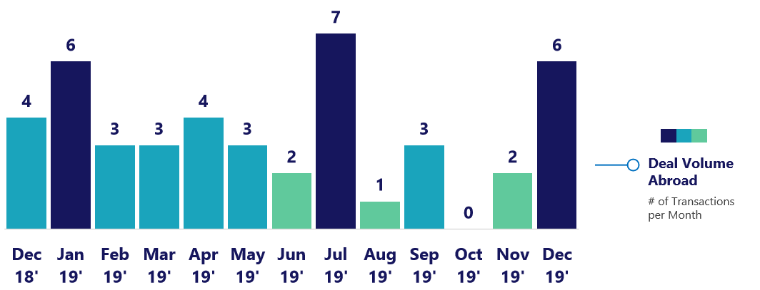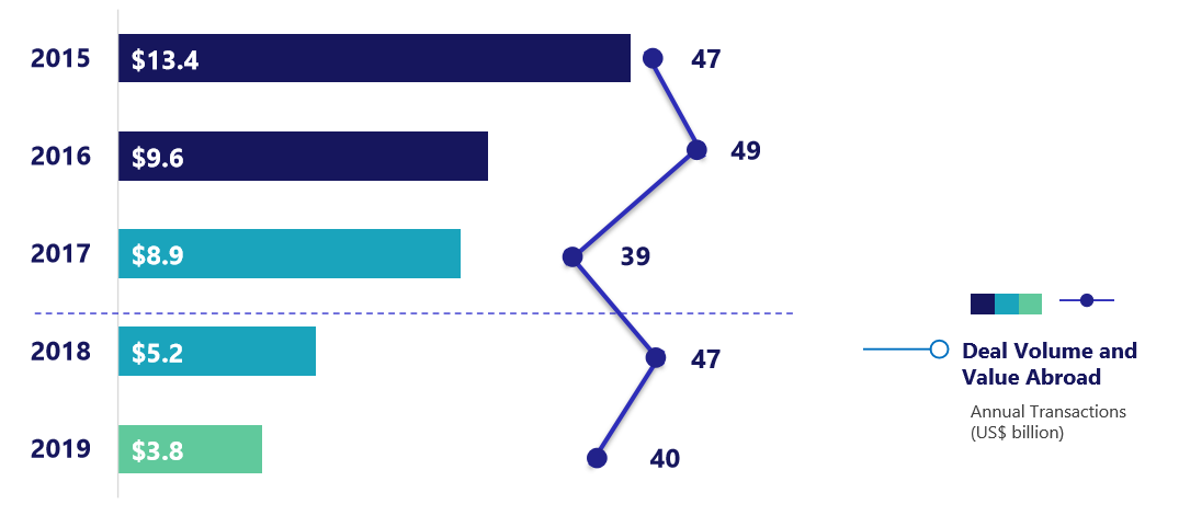 In 2019, the volume and value of announced transactions accumulated to 40 deals worth US$3.8 billion, representing a decrease in volume of 14.8% and a decrease in reported value of 26.9%Year-Over-Year.