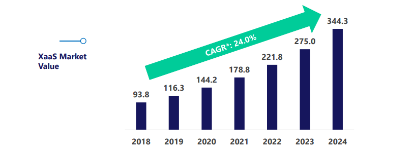 • Globally, the XaaS Market value was valued at US$93.8 billion in 2018, with a CAGR of 24.0% until US$344.3 billion in 2024*