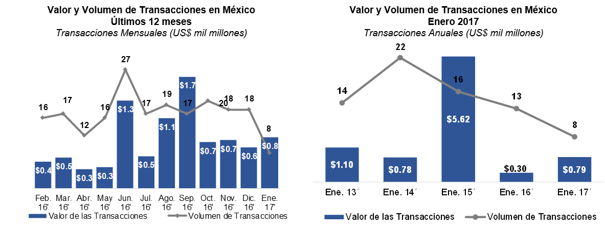 En enero 2017, las transacciones anunciadas sumaron 8, una disminución de 56% respecto al mes pasado. Asimismo, el valor de las transacciones anunciadas descendió a US$781 millones, US$157 millones menos respecto a diciembre del 2016. En comparación con enero del año pasado, se puede observar un incremento de casi el doble en el valor de la transacciones anunciadas, por otro lado, se puede ver una disminución del 38% en cuanto al volumen de las transacciones.