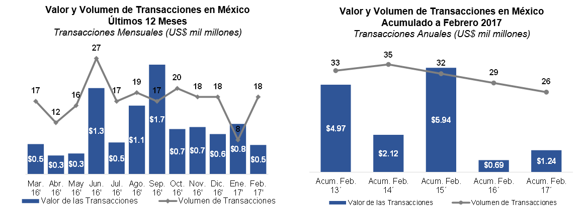 En febrero 2017, el número de transacciones anunciadas sumaron 18, un aumento del 125% respecto al mes anterior. Por el otro lado, el valor de las transacciones sufrió una disminución a US$453 millones, US$328 millones menos respecto a enero del 2017. En comparación con el acumulado a febrero del año pasado, se puede observar una disminución del volumen del 10%, mientras que el valor de las transacciones tuvo un aumento del 79%. Adicionalmente, empresas mexicanas realizaron 2 transacciones en el extranjero con un valor reportado de US$2.9 mil millones.