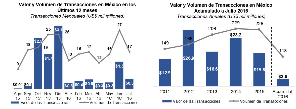 En julio 2016, las transacciones anunciadas sumaron 17, una disminución del 37% respecto al mes pasado. Asimismo se observó una disminución en el valor de las transacciones a US$492 millones, US$847 millones menos respecto a junio del 2016. Por otro lado, el volumen y valor de las transacciones anunciadas acumuladas a julio 2016 fueron 118 y US$3.6 mil millones respectivamente. Adicionalmente, empresas mexicanas realizaron 9 transacciones en el extranjero con un valor reportado de US$4.1 mil millones