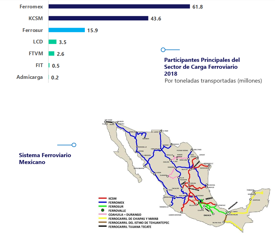 El transporte de carga ferroviario es el segundo más utilizado en México con 17.5% de la participación nacional y138.0 millones de toneladas en 2018.