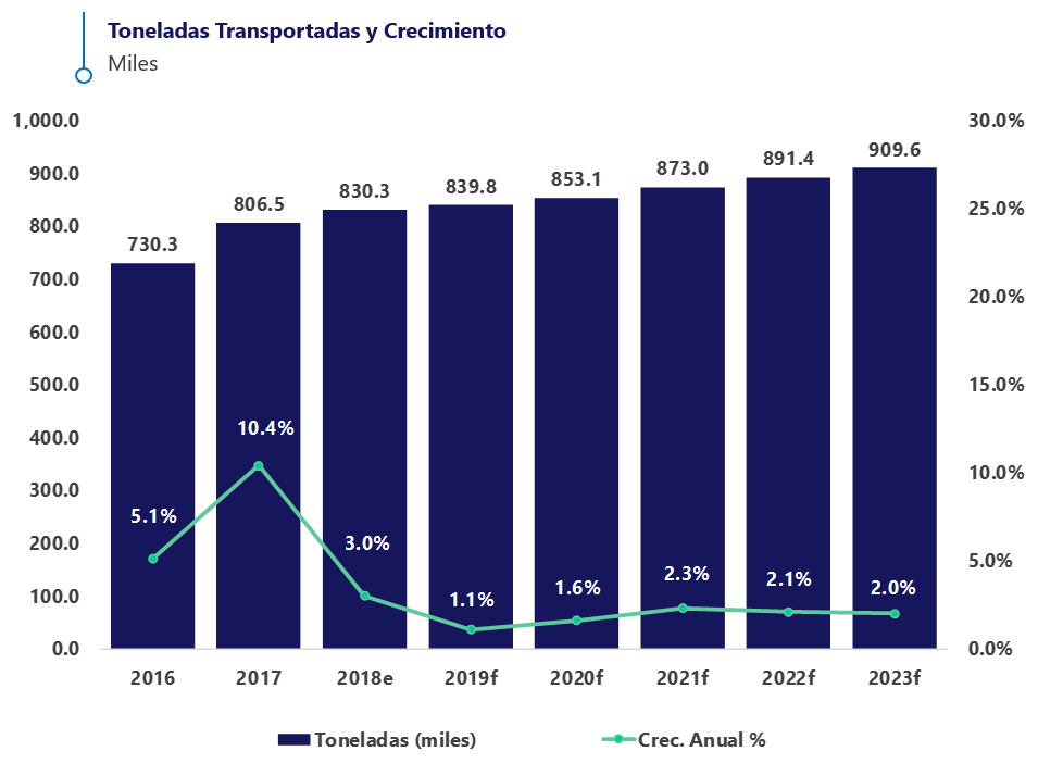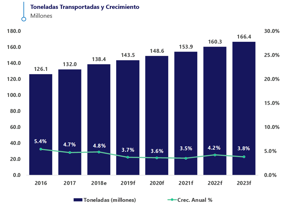 El crecimiento del sector de carga terrestre espera reportar un volumen de 566.0 millones de toneladas y un crecimiento de 1.7% en 2019, y de 2.3% en promedio hasta 2023