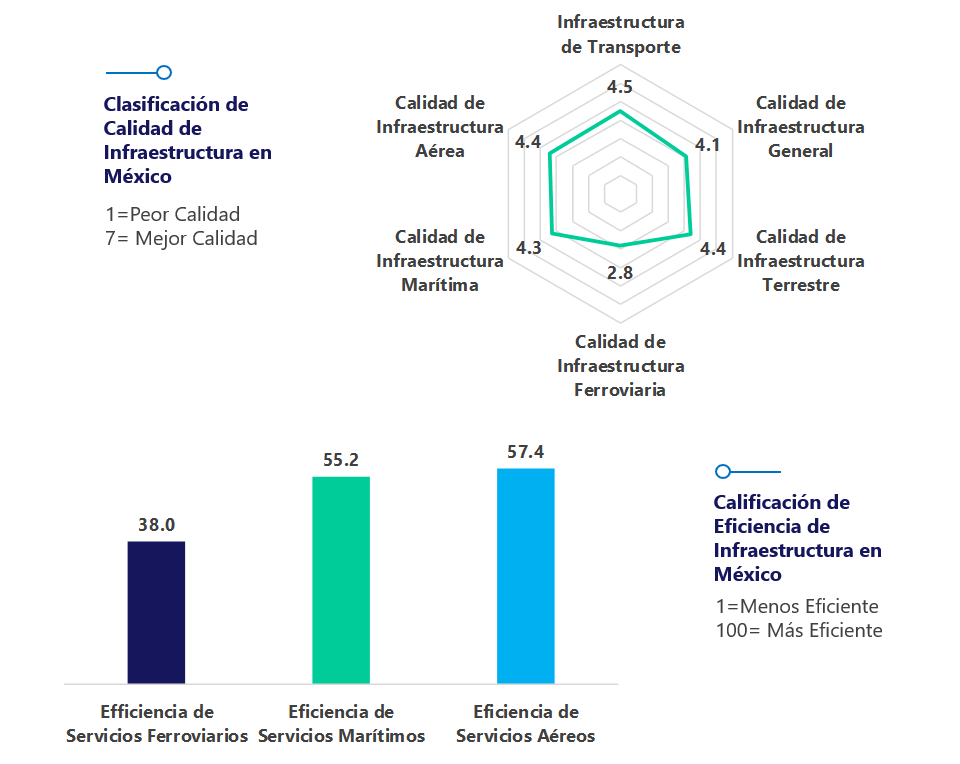 México se posiciona en el lugar 62 en el rubro de Calidad de Infraestructura con una calificación de 4.3 de 7.0
