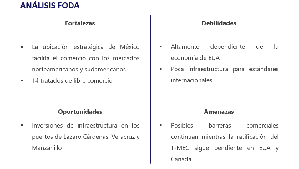 La industria de logística y transporte en México consiste en el intercambio de bienes (manufactura, petróleo, entre otros) por aire, mar, tierra y ferrocarril.